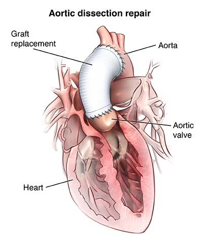 Surgery to repair an aortic dissection is very complicated. Your doctor can explain what to expect for your surgery. You will be given general anesthesia to prevent pain and put you to sleep during the procedure.