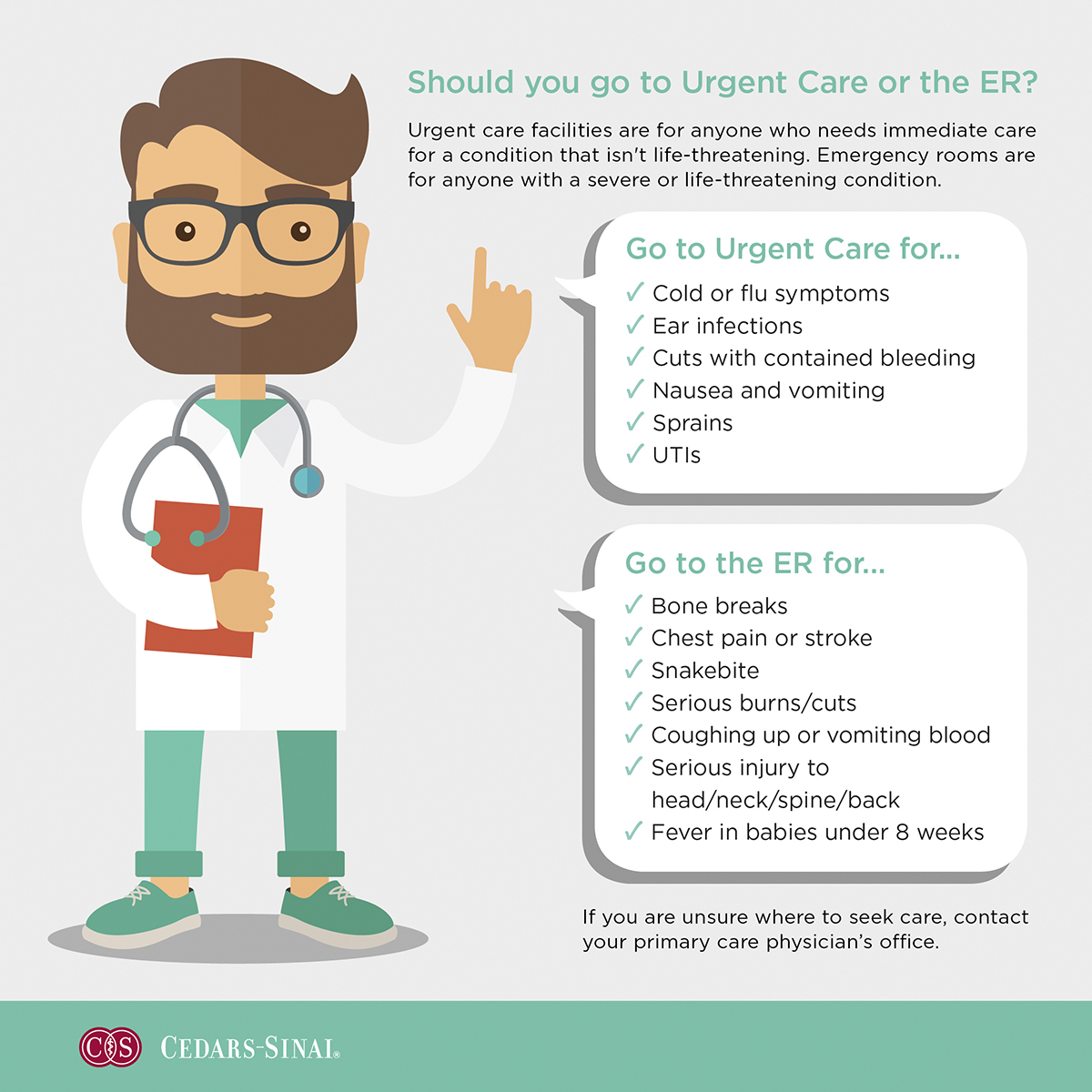 If you're still not sure, call your primary care physician or one of our urgent care offices (310-248-7000 or 310-423-3333) to ensure you receive care in the most appropriate setting.