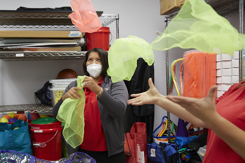 I really cherish my team and the work that we do. We all work well together because we have a connected teamwork mentality and we always support each other. On a typical day, we prep healthy snacks for approximately 300 students in a single afternoon. Sometimes we're all in the kitchen prepping for a few hours the day before, putting all the ingredients into containers or individual bags of our low-sugar, low-sodium, low-calorie, healthy trail mix—like here with my colleagues Esther Valerio and Sara Brown, and our graduate student intern Anahi Luna.
